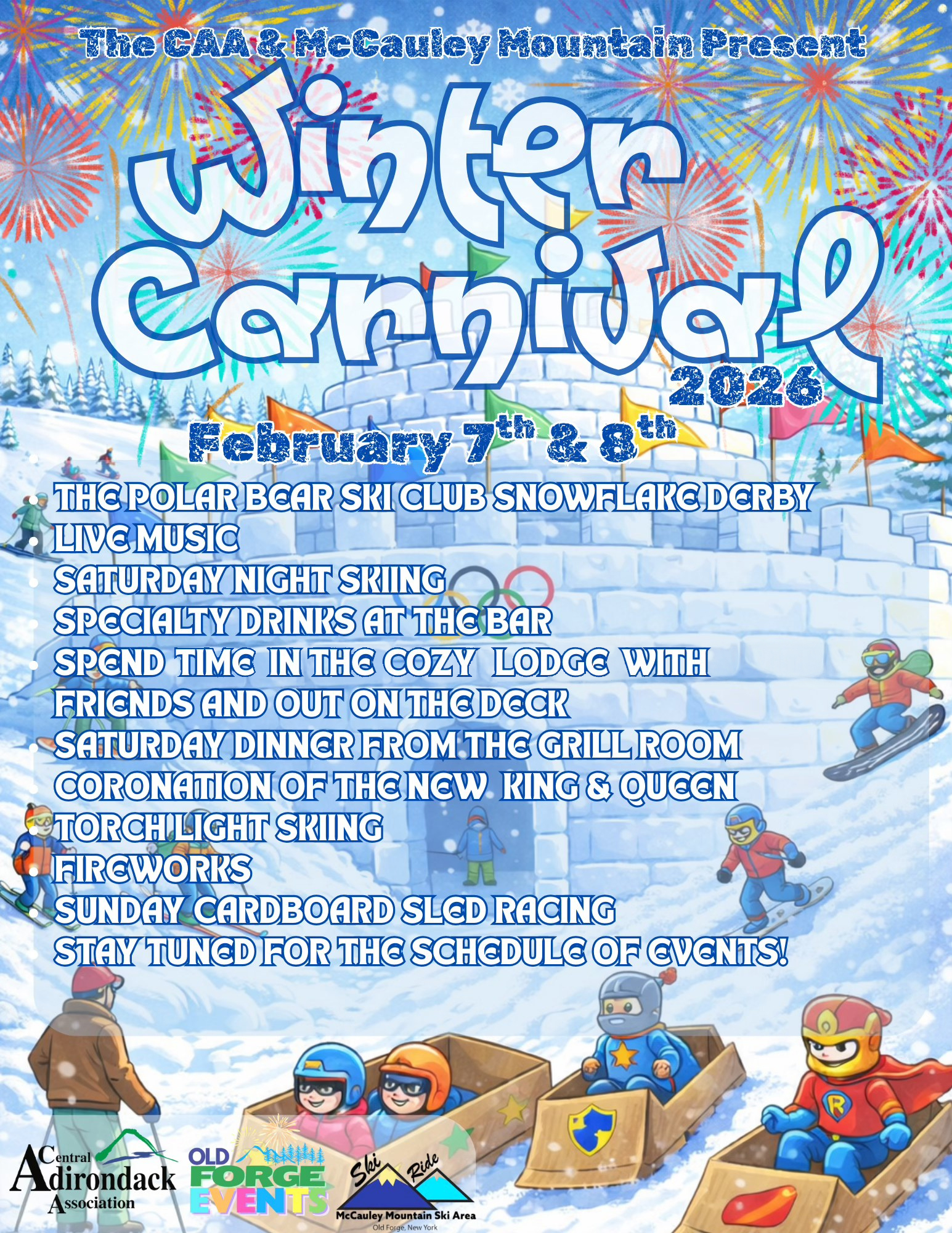 Old Forge’s Winter Carnival 2026! Everyone is welcome to join in the fun and get creative with themed floats and costumes. February 7 & 8, 2026! Get ready for the Winter Carnival! The snow’s falling, and we’re pumped for a snowy February. Join us in town for shopping, dining at local restaurants, and skating at the ice rink on lower Joy Track. For more info, call the Old Forge Visitor Information Center at 315-940-2267. Let’s have a blast at Winter Carnival! This is a great Family Weekend, so come join us at the Old Forge Camping Resort. Call or book online now!
